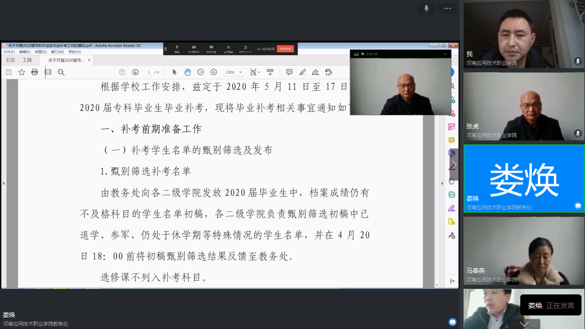 娄焕副院长宣读教务处下发《关于2020届毕业生顶岗实习材料收缴,评定,成绩上报的通知》、《加强教学检查的通知》、《关于开展2020 届专科毕业生毕业补考工作的通知》根据文件,对学院补考工作进行布置,要求一是毕业班辅导员第一时间及时通知到补考学生,二是承担补考任务的教师在规定时间内出好试卷并做好保密工作,三是提前做好网络补考测试,留存测试截图,四是做好补考成绩的上报工作。