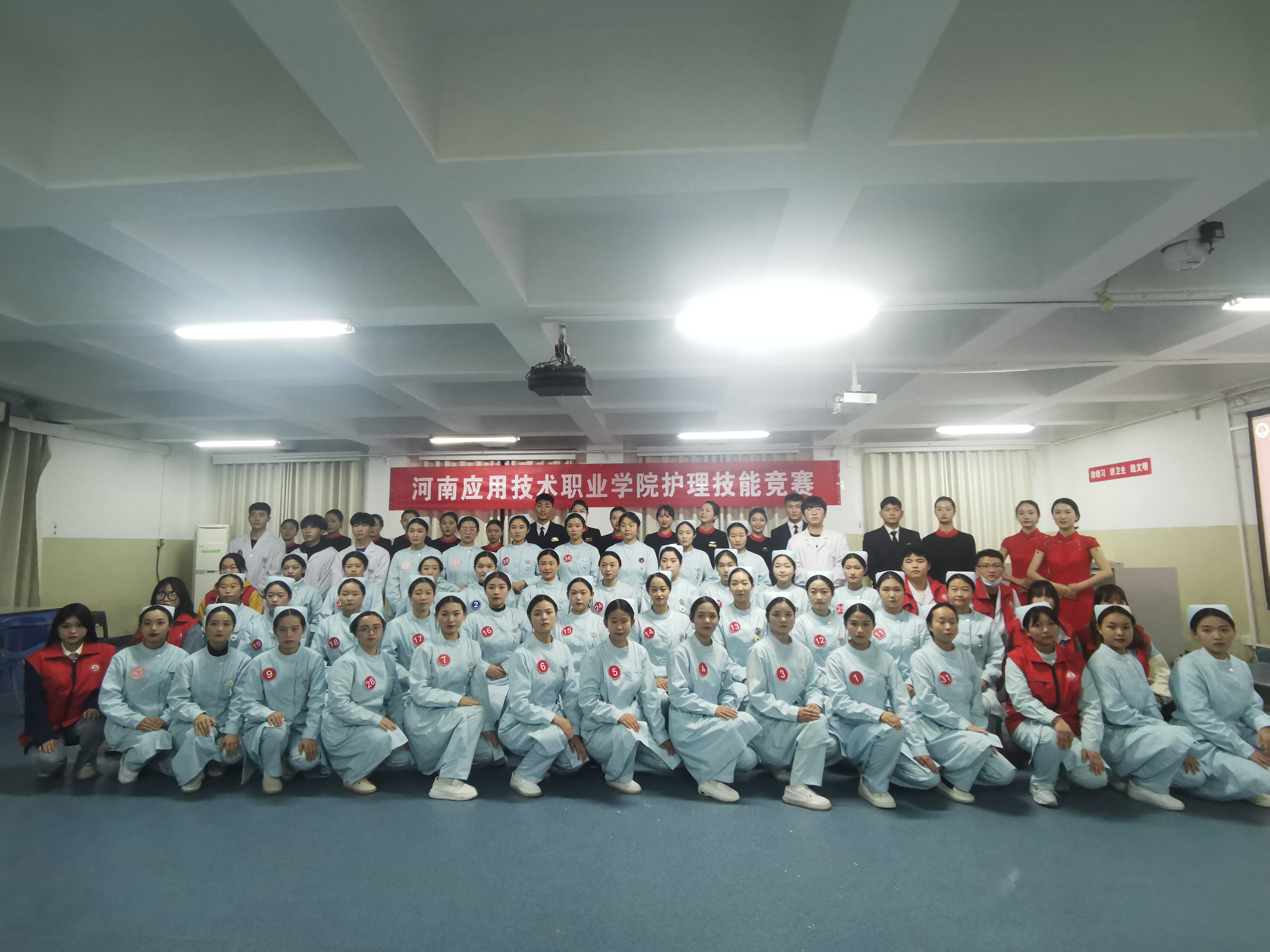 河南应用技术职业学院第七届护理技能竞赛于2021年11月25日下午17:00在1号实训楼(D楼)207举行,护理学院王风云院长致辞,通过真实事例为同学们科普掌握心肺复苏的重要性并对此次参加比赛的选手表示殷切的期望。此次比赛项目为心肺复苏术,参赛选手分为医护专业组(护理、助产专业)43名和非医护专业组(空乘专业)10名。