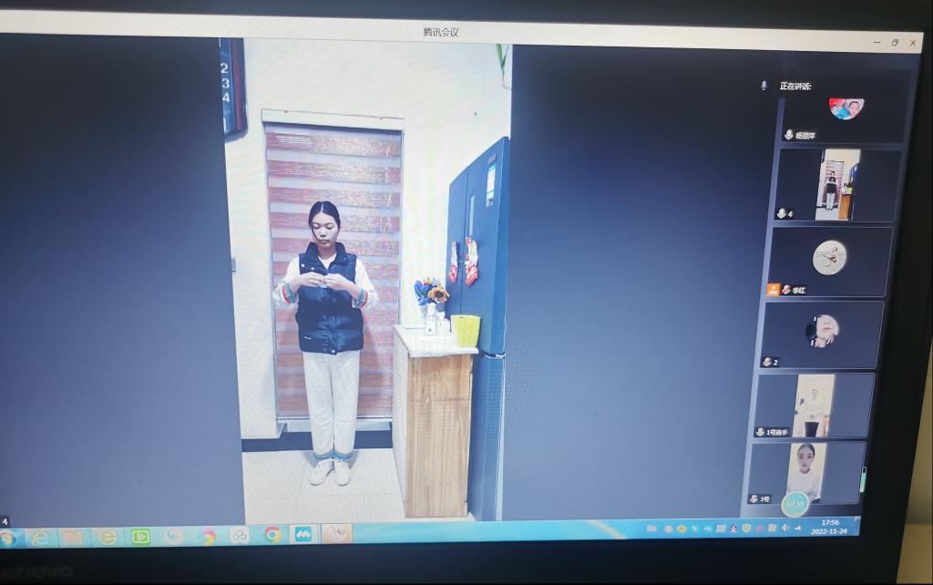 本次大赛的参赛对象为2021级护理及助产专业学生,考核项目分为理论和技能实操两部分,经过前期初赛选拔共计50名学生入围决赛。决赛开始前选手抽签决定出场顺序,理论考核要求学生使用双设备,一部设备进入腾讯会议接受监考,另一部设备进入学习通参加理论考核,学习通后台同步监控,双平台进行监考。为体现比赛公平性,技能环节要求选手将昵称改为抽签序号,进入腾讯会议等候室,4人一组,再依次进入赛场参加技能比赛。实操比武过程中,选手们运用自己实践所学,从检查物品的名称、有效期、七步洗手、戴脱无菌口罩等环节进行了一系列操作演示。