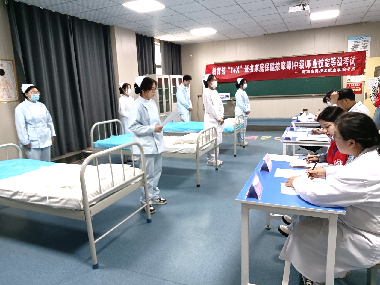 为贯彻执行《国家职业教育改革实施方案》,落实高职院校“学历证书+若干职业技能等级证书”试点建设工作,2023年5月7日,河南应用技术职业学院护理学院开展教育部“1+X”家庭保健按摩职业技能(中级)证书考试,共有100名学生参加了此次考试,其中所有考生的考试成绩均通过,通过率达到100%。