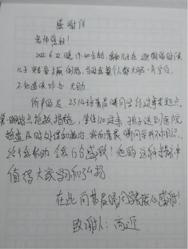 第二天下午患儿家属通过广场安保人员辗转联系到曹晨曦同学,家属非常感激并当面感谢,同时送来了感谢信,感谢曹晨曦同学的及时救助,为抢救患儿争取了宝贵时间,家属说:“我和曹晨曦同学并不相识,但他给我的帮助令我万分感激,他的这种精神值得大家学习。”主治医师也表示曹晨曦同学的处理方式非常妥当。