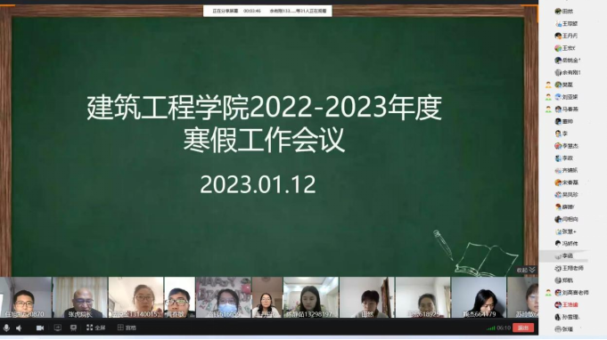 为进一步做好我院放假前后相关工作,确保学院假期各项工作平稳、安全、有序,确保师生度过一个欢乐祥和的假期,2022年1月12日,建筑工程学院通过QQ会议召开了2022-2023年度寒假工作会议,学院领导班子及全体教师参加会议,会议由院长张虎主持。