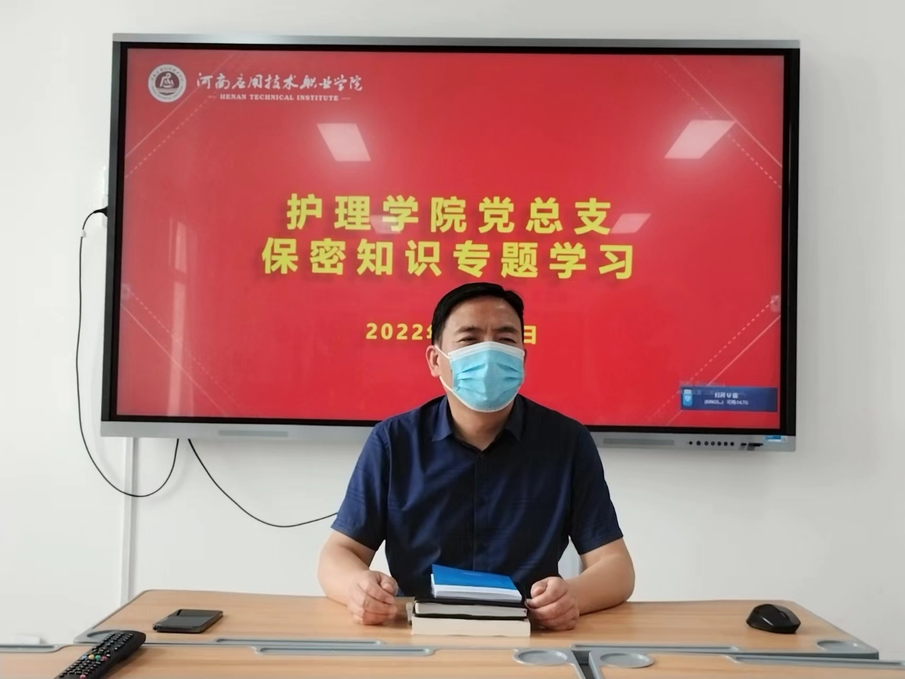 为深入贯彻习近平新时代中国特色社会主义思想,进一步提高保密意识,护理学院党总支于2022年4月26日组织全体教师在A515党员活动室召开会议,集中学习保密知识及《习近平新时代中国特色社会主义思想学习问答》,会议由党总支书记杨明杰主持。
