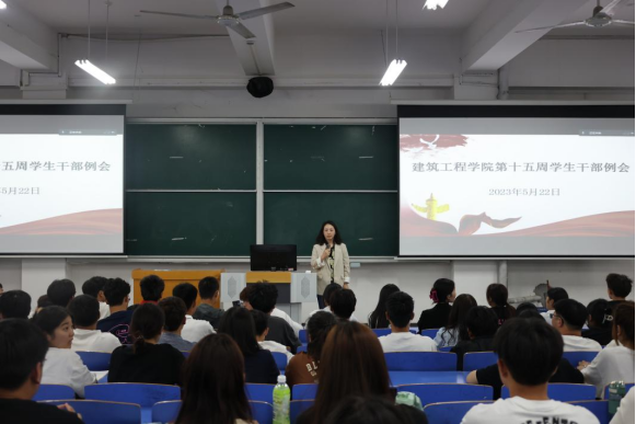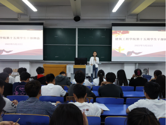 为提高学生干部积极性、主动性以及学生干部的综合素质,为学生提供更好的服务。2023年5月22日中午,建筑工程学院在郑州校区B201教室召开了第十五周学生干部例会(开封校区以视频形式在C201教室参加会议)。会议由建筑工程学院辅导员李慧杰主持,党总支副书记刘亚娟,辅导员宋春磊、李政、张慧以及学生会全体成员、各班班长和团支书参加此次会议。