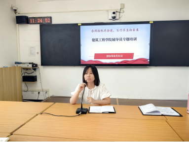 建筑工程学院举办2024级新生辅导员专题培训为进一步强化辅导员队伍建设,精细管理新生事务,确保工作高效有序进行,8月31日至9月1日,建筑工程学院举办2024级新生辅导员专题培训。学院党总支副书记刘亚娟、辅导员李慧杰、苏玲敏3名老师围绕新生班级建设、学生工作“五个一”、学风建设、学分管理制度等新生引航各个方面开展辅导员职业能力和工作方法专题分享。学院党总支书记张虎和新生辅导员参加本次培训,培训由刘亚娟主持。