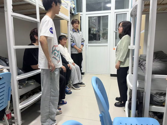 班会结束后,辅导员们深入学生宿舍,了解同学们的生活状况。在宿舍里,他们与学生亲切交流,关心大家假期归来后的感受,询问是否存在生活上的困难。辅导员们还仔细检查了宿舍卫生和用电安全情况,倡导同学们养成良好的生活习惯,保持宿舍整洁卫生,注意用电规范,共同营造安全舒适的宿舍环境。
