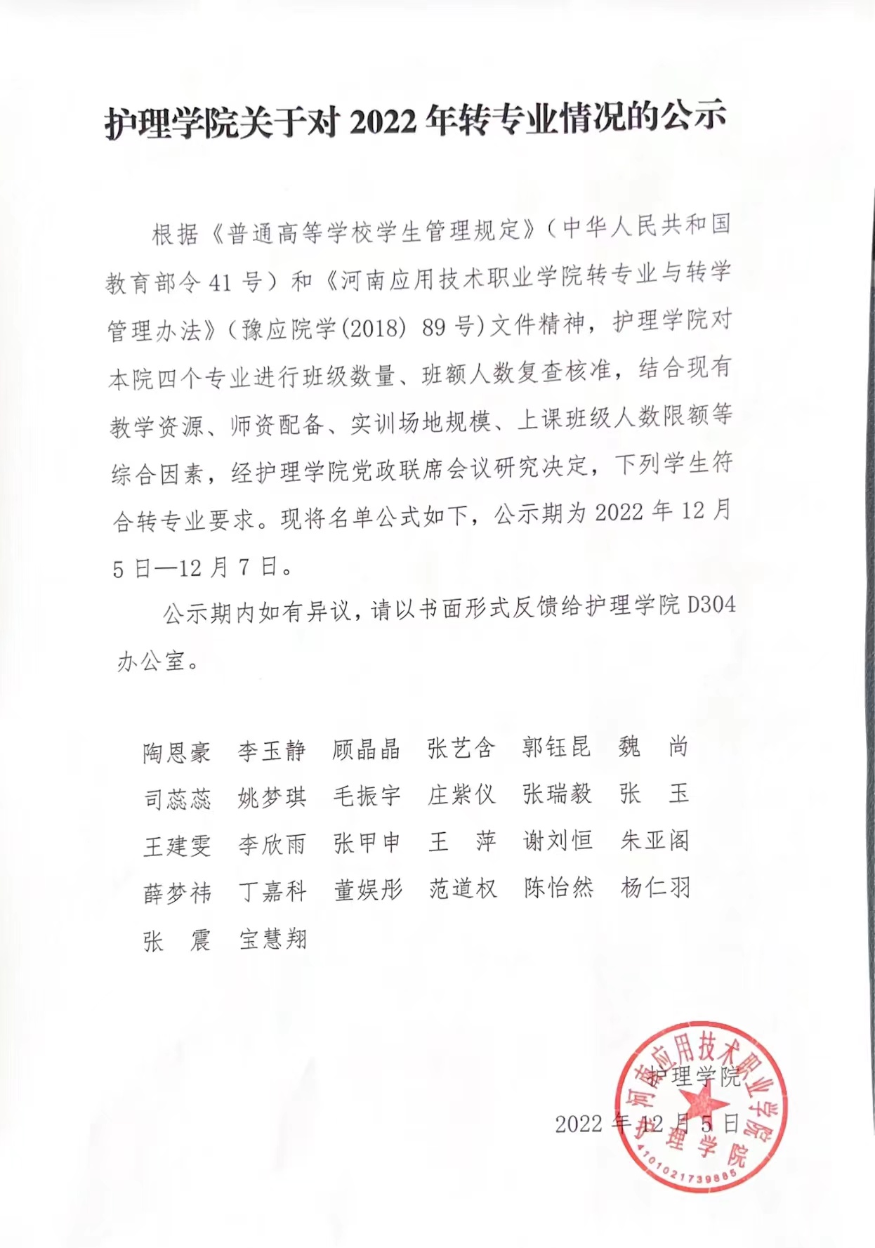 护理学院关于对2022年转专业情况的公示
