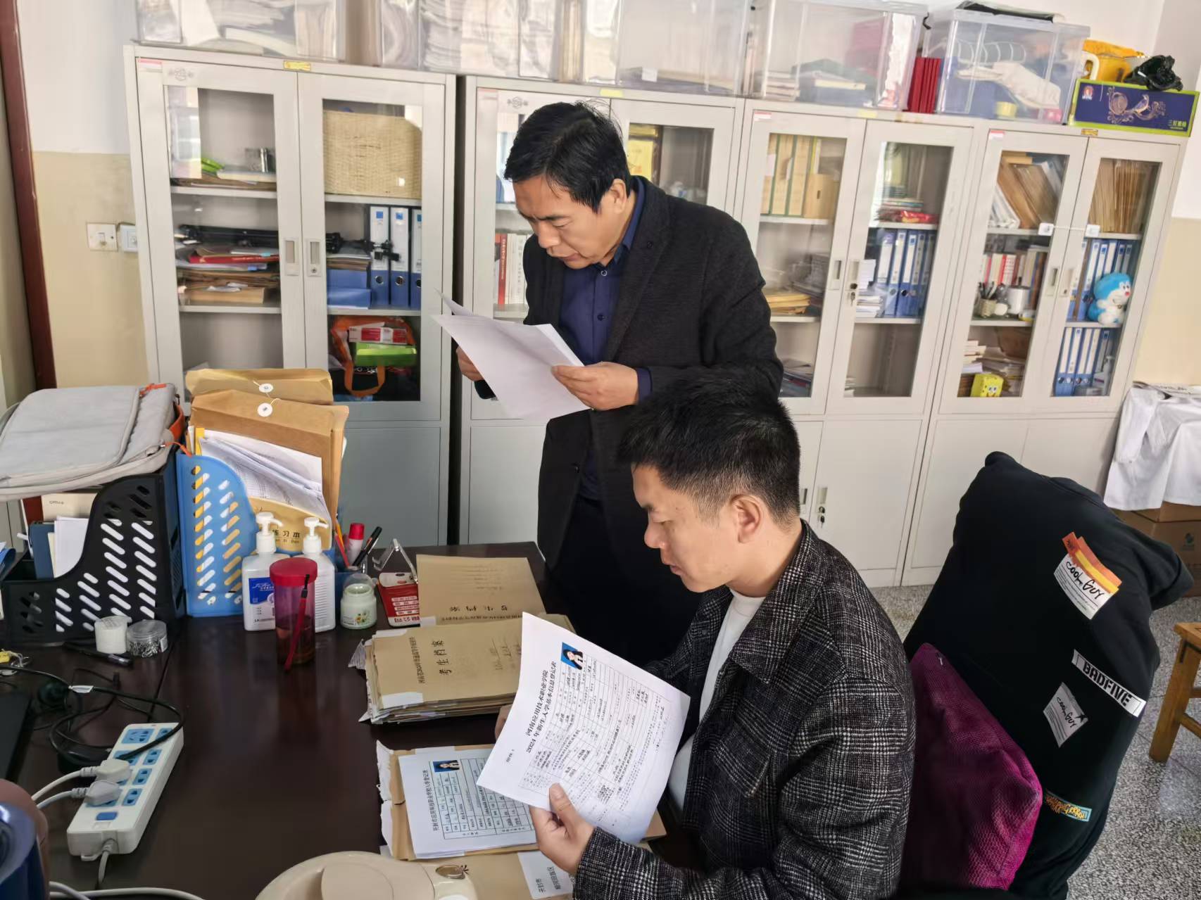 会议过后,杨明杰到学院办公室对学生学籍学历管理工作进行了调研,同时查看了学生档案管理情况,并提出了指导意见,接着又对保管的学生档案进行查阅。