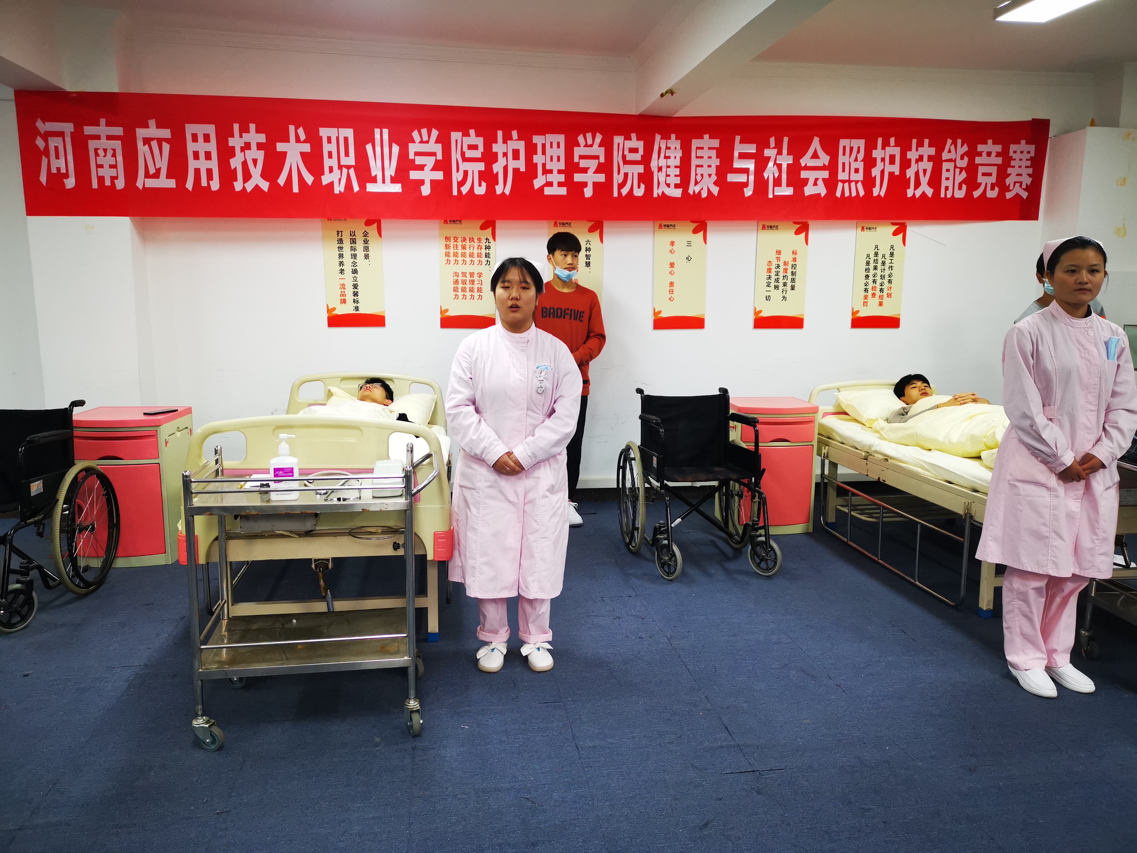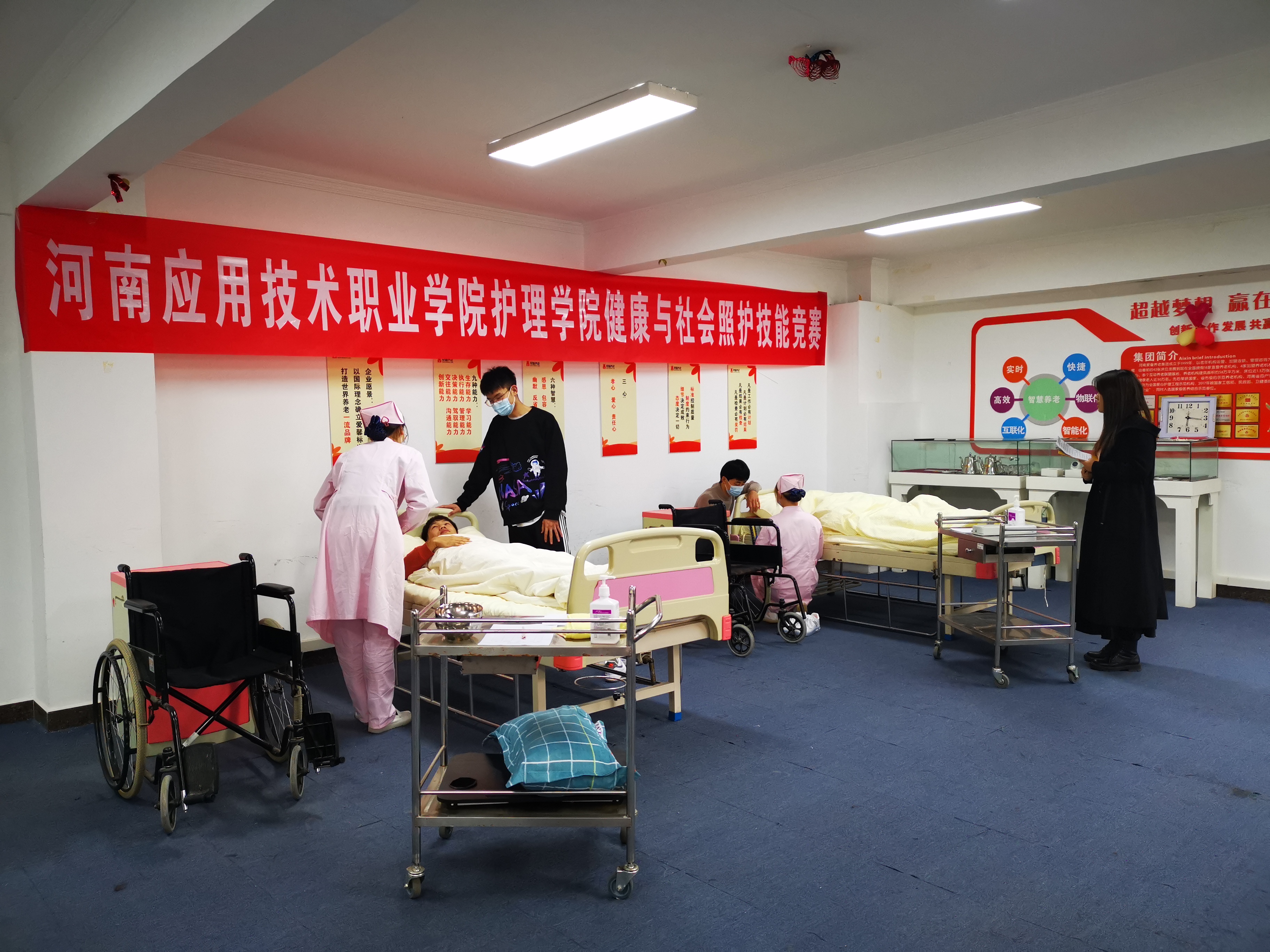 2020年11月27日上午10点,河南应用技术职业学院首届健康与社会照护竞赛在河南爱馨养老集团展馆2楼大智慧教室顺利举行。护理学院老年保健与管理专业32名学生参加了此次比赛。本次技能比赛以世界技能大赛健康与社会照护赛项为引领,“以赛促教、以赛促改、赛教融合、赛训融合”,对接国家、行业等标准,以培养选拔国家技能大赛选手和促进职业教育高质量发展为目标,比赛设定医院、长期照护中心、日间照护中心以及家庭四个竞赛模块,不但能够提升参赛者健康与社会照护需要的知识和技能,同时提升其组织管理能力、沟通和人际交往能力、解决问题等能力等。