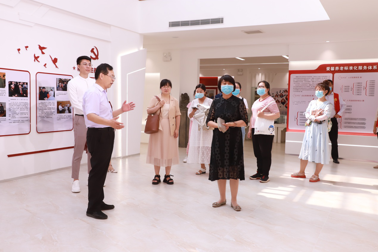 首先大家来到爱馨敬老文化展览馆参观,受到集团党支部副书记马学才、副总卢以轩等工作人员的热情接待。马书记为大家讲解了爱馨党建工作和企业文化建设、集团的两个“三六九”体系(即标准化服务体系的三位一体、六大标准、九种需求与教育培训体系的三心、六智慧、九种能力),这与我校对老年保健与管理专业学生的培养理念、及专业人才的重视程度高度统一。