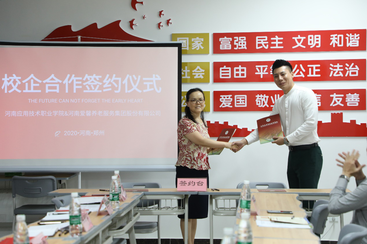 为响应国家关于加强学校和企业合作的号召,充分发挥学校与企业双方优势及高等教育为社会、为企业服务的功能,更好的为社会、为企业培养高素质、高技能的应用型人才,同时也为学生实习、实训、就业提供更多空间,在双方共同努力下,6月15日上午,河南应用技术职业学院和河南爱馨养老服务集团股份有限公司校企合作签约仪式在行政楼515会议室召开。河南爱馨养老服务集团股份有限公司集团副总经理卢以轩,教育部主任马可,行政秘书赵亚楠,品牌策划裴正阳以及河南应用技术职业学院副院长赵玉奇,河南应用技术职业学院副院长陈君丽,教务处、招生就业处相关领导、护理学院院长王风云、书记徐娟、副院长陈永惠及教师代表出席本次签约仪式。