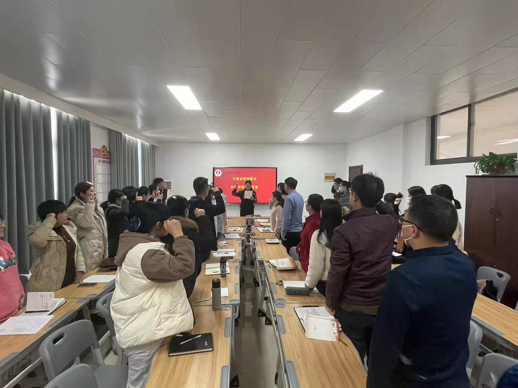 最后,由护理学院温晓丽老师带领大家宣誓河南省教师誓词。庄严肃穆的宣誓仪式,全体教师紧握右拳,在温晓丽老师的带领下,认真宣读河南省教师誓词:我志愿做一名光荣的人民教师,忠诚人民教育事业,贯彻党的教育方针。爱国守法,敬业爱岗;教书育人,关爱学生;传承文明,勇于创新;严谨治学,启智求真;为人师表,乐于奉献。为实现中华民族的伟大复兴而努力奋斗。