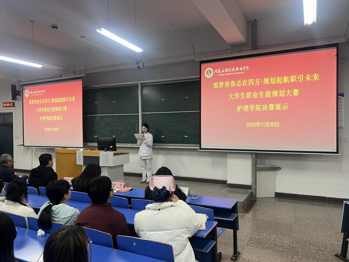 为进一步提升大学生职业生涯规划能力,努力将大学生职业生涯规划大赛打造成强化生涯教育的大课堂、服务毕业生就业的大市场。2023年11月30日护理学院在二号教学楼301组织开展大学生职业生涯规划大赛决赛。