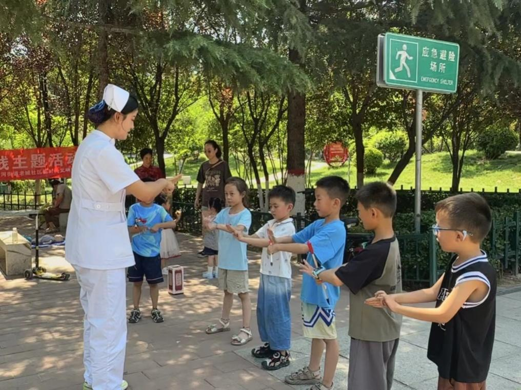 活动现场,护理学院师生志愿者服务团队为每一位到来的居民提供了血压测量、健康咨询等基础医疗服务,并调研社区老年人BMI指数、慢性病多病共存状况,了解基层老年人健康状况。志愿者们耐心倾听居民们的问题,根据他们的身体状况给出合理的饮食和生活建议。具有美国心脏协会导师培训资质的刘丽老师给居民们普及心肺复苏急救、自动体外除颤仪AED的使用及海姆立克急救法等急救技能。学生志愿者指导孩子们练习“七步洗手法”,树立儿童卫生意识。活动现场,还给孩子们准备了“投壶”互动小游戏,深受孩子们的喜欢。
