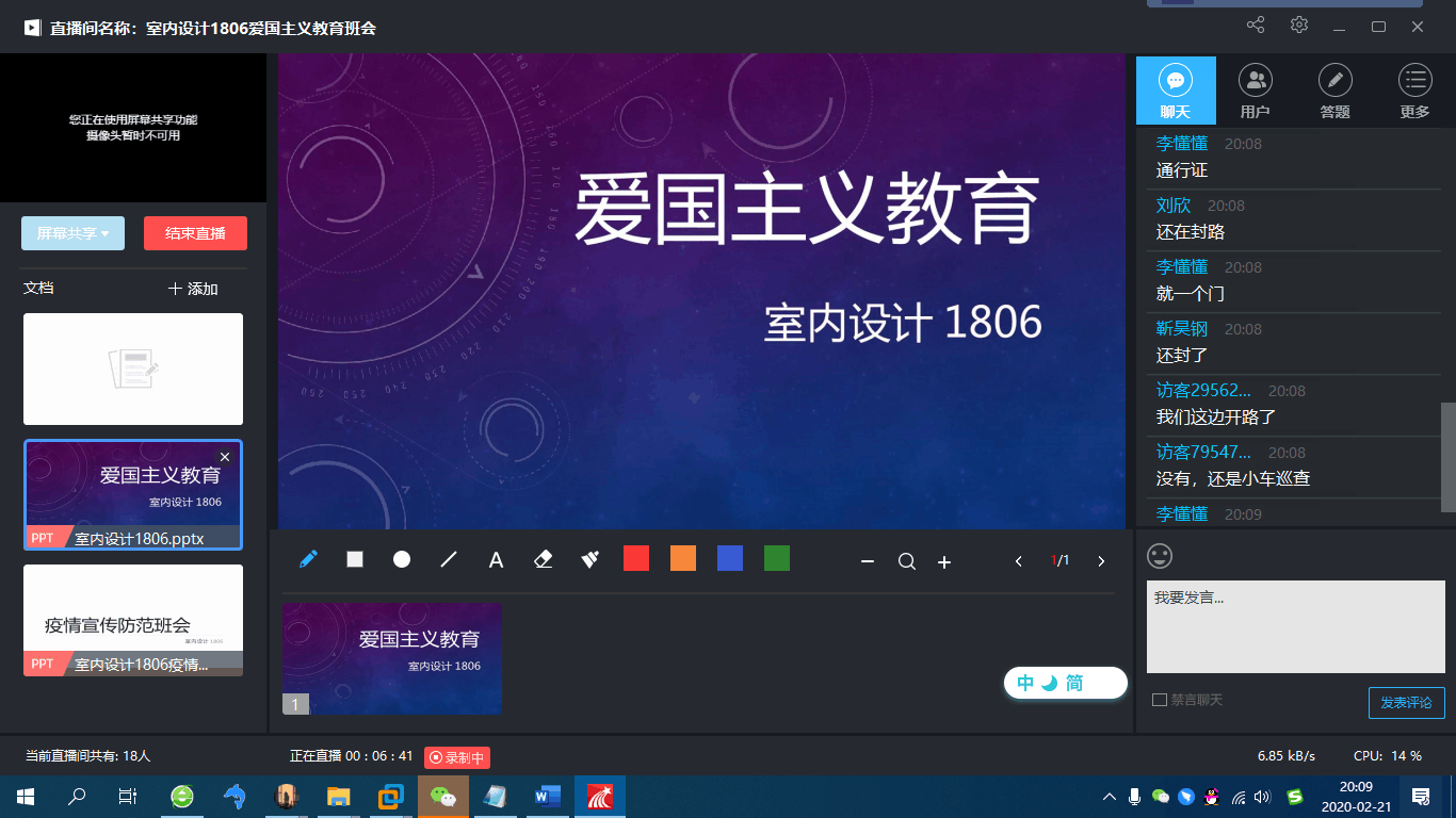 为教育广大学生提高疫情防范意识,深入贯彻落实爱国主义教育,建筑工程学院于2月先后开展了“疫情就是命令,防控就是责任”以及“爱国主义教育”两次主题班会。建筑工程学院42个班级共1480名学生参加,以班级为单位,由20名辅导员主持,依托QQ、企业微信、钉钉等网络方式进行宣传教育会议。