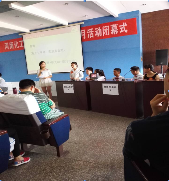 2015年5月19日为弘扬传统文化,增强大学生读书意识,由我院举办的“让古典名著回归校园”的读书月活动顺利举办,旨在倡导当代大学生从古典名著中汲取经久不衰的养分和历久弥新的国学意蕴,让同学们更好的践行社会主义核心价值观,本次国学比赛我系学生积极参与筹备,经过几轮比赛的角逐,最终在B楼学术报告厅进行国学大赛的总决赛。