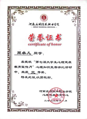 2022年11月 荣获koko体育官网心理知识竞赛三等奖