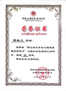 2022年11月荣获koko体育官网心理知识竞赛三等奖