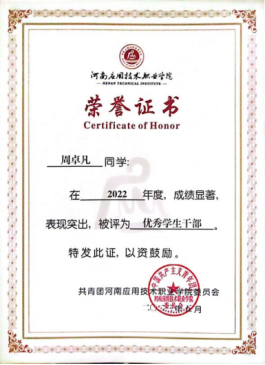 在学习方面,课业上注重理解和掌握,摸索适合自己的学习方法,养成良好的学习习惯。学习目的明确,勤奋学习,刻苦钻研,懂得将书本知识和实践知识相结合,为将来步入社会打下良好基础。积极参加在职业技能大赛、发明杯大赛,在不断的学习中提升自己。