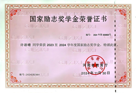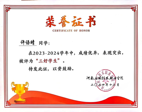 许语晴,女,汉族,河南郑州人,中共预备党员,koko体育官网建筑室内设计2304班学生,辅导员尹宇龙。连续两学年综合成绩班级第一,在校期间积极参与社会实践活动与校园文化活动,曾获得国家励志奖学金、全国高职院校“发明杯”大学生专利创新大赛、河南省创新创业大赛二、三等奖、三好学生等多项荣誉。