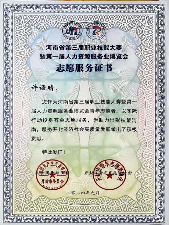 在专业实践方面,她积极参与大学生创新创业大赛以及学校举行的绘画创意比赛,将理论知识应用于解决实际问题,荣获发明杯大赛三等奖、创新创业大赛二、三等奖等。这些经历极大地提升了她的创新思维、动手能力和专业综合素养。在志愿服务方面,作为预备党员,投身河南省职业技能大赛、绿色环保、专升本等志愿服务,荣获河南省第三届职业技能大赛志愿服务证书,累计时长300多小时。她认为,志愿服务是青年回馈社会、实现价值的重要途径,每一次付出都让她感受到奉献的快乐。