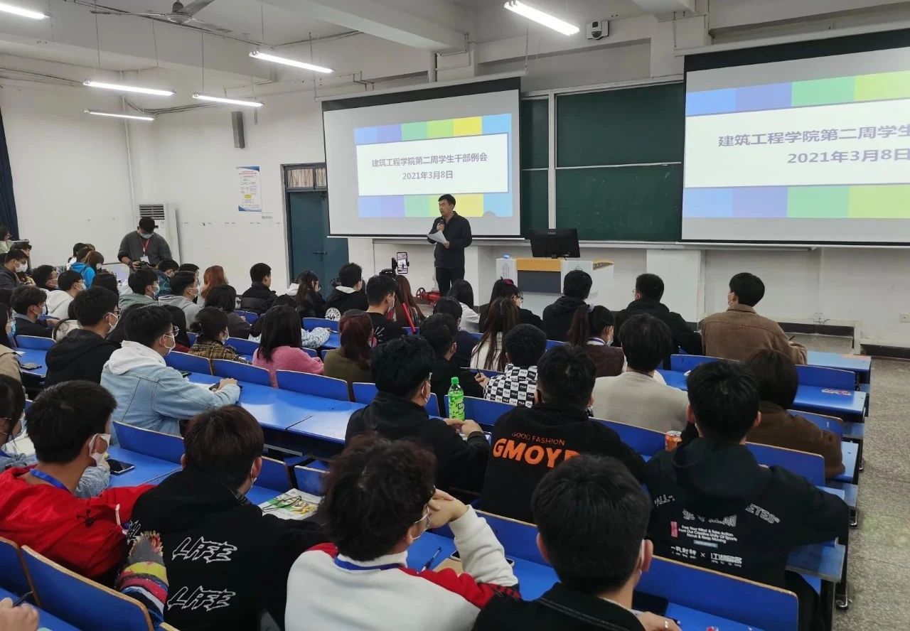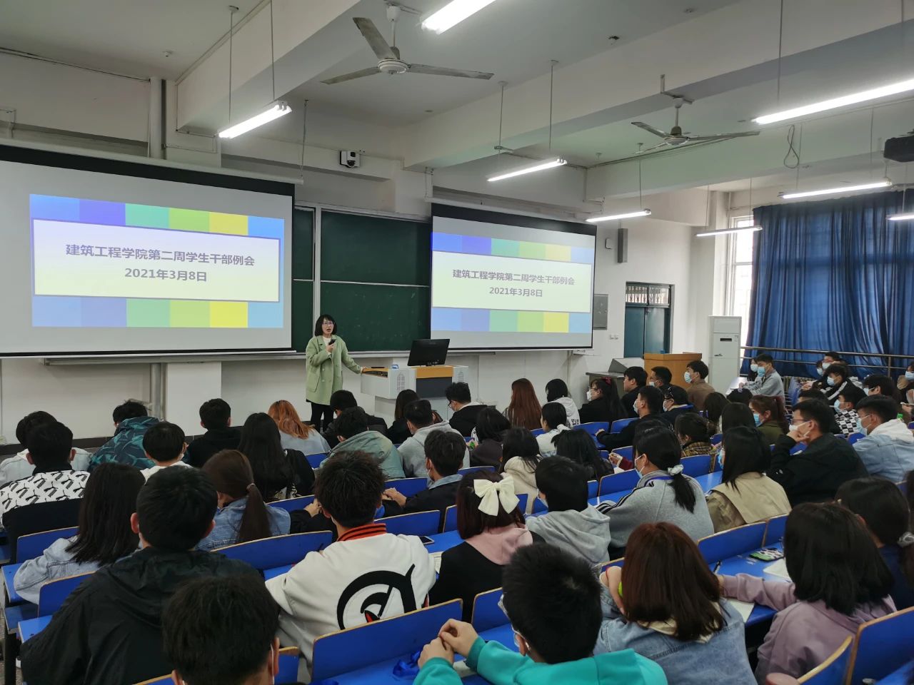 为提高小筑们的积极性,提升工作和学习的效率,建筑工程学院于2021年3月8日中午12:30,在B楼102教室召开了建筑工程学院第二周学生干部例会,(东校区以视频会议方式参加),参与本次会议的有刘高喜老师、刘亚娟老师、李慧杰老师、孙雪理老师、团学会全体成员、入党积极分子及各班班长、团支书。