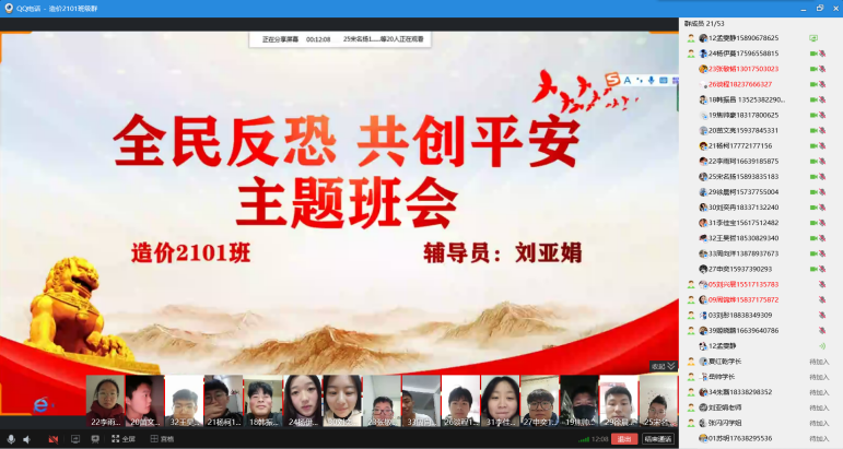 为深入贯彻落实习近平总书记关于反恐怖工作的重要指示精神,进一步推进反恐怖宣传教育进校园,教育学生树立安全意识,提高全体学生的安全防范意识和突发事件的应变能力。2021年12月28日至2022年1月6日,建筑工程学院组织各班级开展“全民反恐,共创平安”主题班会。
