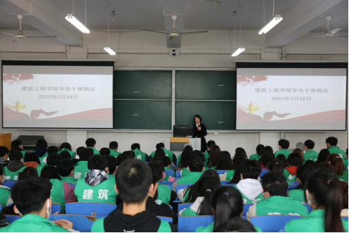 为提高学生干部的积极性和凝聚力,提升工作和学习的效率,2022年2月28日中午,建筑工程学院在郑州校区B201教室召开了建筑工程学院学生干部例会(东校区通过视频的形式参加会议),会议由学院团总支书记刘亚娟主持,辅导员李慧杰、孙雪理以及学生会全体成员和各班班长、团支书参与此次会议。