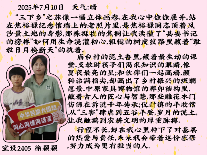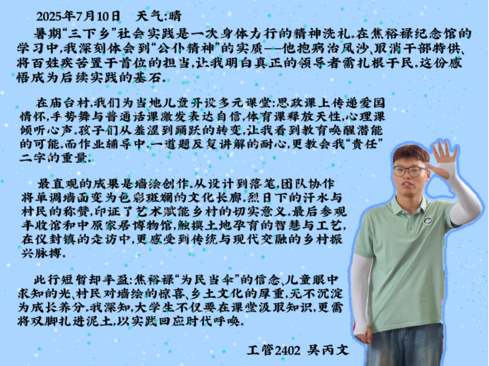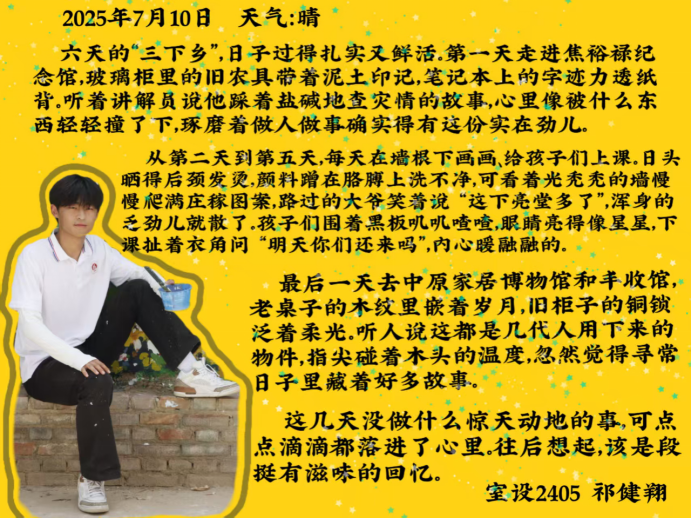 建筑工程学院“小筑”志愿服务队暑期“三下乡”社会实践的余热尚未褪去,队员们带回的不仅是兰考大地的风尘,更有浸润在乡土里的思考与成长。从支教课堂上的童真互动,到墙绘现场的协作攻坚,从博物馆里的古今对话,到与村民攀谈时的质朴共鸣,不同的实践场景里,藏着同样滚烫的收获。让我们继续倾听他们在乡土间播撒青春、收获感悟的故事。